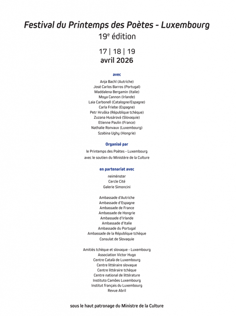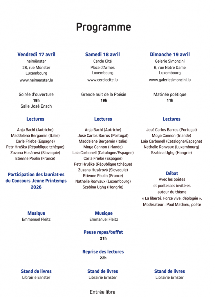 Autour du thème « La liberté. Force vive, déployée », le 19e Festival du Printemps des Poètes – Luxembourg se tiendra les 17, 18 et 19 avril 2026 à neimënster (soirée d’ouverture le 17), au Cercle Cité (grande nuit de la poésie le 18) et à la galerie Simoncini (matinée de clôture le 19). Onze poétesses et poètes y sont attendu.e.s ainsi que le musicien Emmanuel Fleitz (neimënster, Cercle Cité).